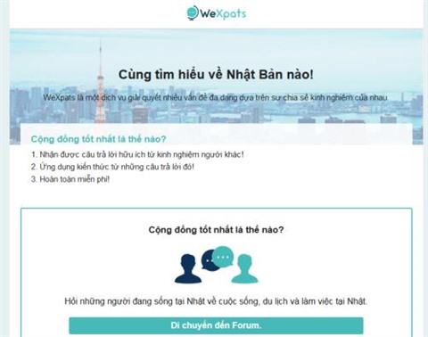Pour cette raison, le site https://we-xpats.com/vi/destination/as/jp/ a été créé, pour devenir un espace de débats pour les Vietnamiens vivant au Japon. Ce site comprend également des informations utiles sur le Japon, écrites par des auteurs japonais et vietnamiens résidant dans ce pays.