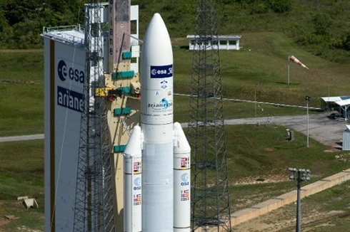 | Photo transmise par l'Agence spatiale européenne montrant la fusée Ariane 5 qui doit lancer l'ATV-5, avant son décollage le 29 juillet à Kourou. |