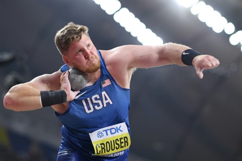 | L'Américain Ryan Crouser lors de l'épreuve du lancer du poids des Mondiaux d'athlétisme à Doha. |