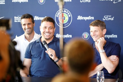 | L'ancien international brésilien Ronaldo (2e, gauche), lors d'une conférence de presse à Oslo, le 8 juin. |