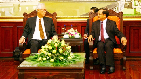 | L'ancien Premier ministre et ministre senior singapourien Goh Chok Tong, a rencontré mercredi 24 septembre à Hanoi le secrétaire du Comité du Parti de Hanoi, Pham Quang Nghi (droite). |