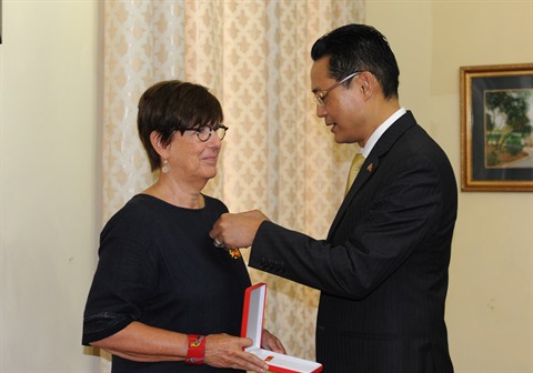 | L’ambassadeur vietnamien NguyênTrung Thành remet l’Ordre d’amitié de l’État vietnamien à Jehanne Roccas. Photo: Vu Lê Hà/VNA/CVN |