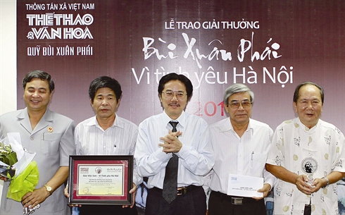 | En 2011, M. Duc (premier à droite) et son équipe de scientifiques ont reçu le prix «Travail pour l’amour de Hanoi» pour avoir guéri la tortue jusqu’à ce qu’elle reçoive son bon de sortie. |