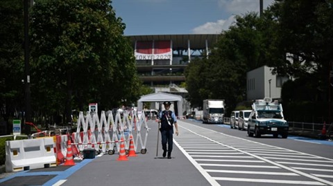 | Un policier devant le stade olympique de Tokyo, le 19 juillet. |