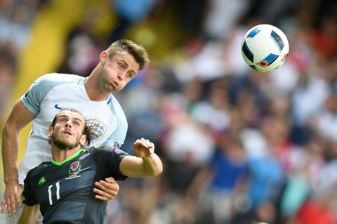| Le défenseur anglais Gary Cahill monte plus haut que la star galloise Gareth Bale, lors du match entre leurs deux équipes à Lens, le 16 juin. |
