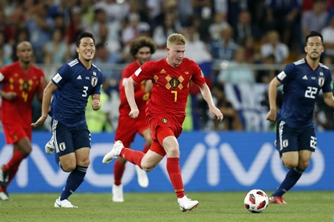 | De gauche à droite : Gen Shoji (Japon), Kevin De Bruyne (Belgique) et Maya Yoshida (Japon), le 2 juillet 2018 à Rostov-sur-le-Don. |
