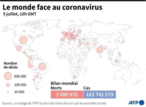 Le COVID-19 a fait au moins 3,98 millions de morts depuis son apparition fin 2019, selon un bilan établi lundi par l'AFP.