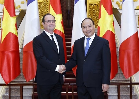 | Le Premier ministre vietnamien Nguyên Xuân Phuc (droite) et l'ancien président français François Hollande, le 6 septembre 2016 à Hanoï. |