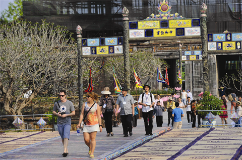 | Des touristes étrangers en visite de la cité impériale de Huê. |