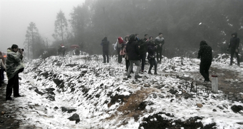 | Des touristes prennent des photos avec la neige à Sa Pa, dans la province montagneuse de Lào Cai (Nord). |