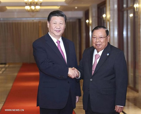 | Le secrétaire général et président chinois Xi Jinping (droite) et son homologue lao Bounnhang Vorachit, le 14 novembre à Vientiane. |