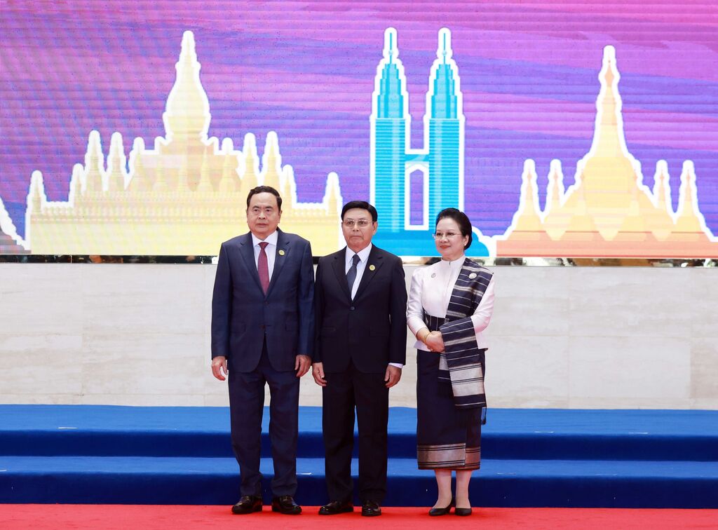 | Le président de l'Assemblée nationale lao, également président de l'AIPA, Saysomphone Phomvihane (centre), et son épouse accueillent le président de l'Assemblée nationale vietnamienne Trân Thanh Mân à la séance d'ouverture de l'AIPA-45. |