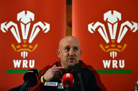 | Shaun Edwards, entraîneur adjoint du XV gallois, en conférence de presse, le 27 septembre 2015 à Cardiff. |