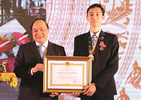 | Le vice-Premier ministre Nguyên Xuân Phuc (gauche) a remis l’Ordre de l’indépendance de la 3e classe à Nguyên Duy Thanh, lauréat du Mondial des métiers, organisé au Brésil en 2015. |
