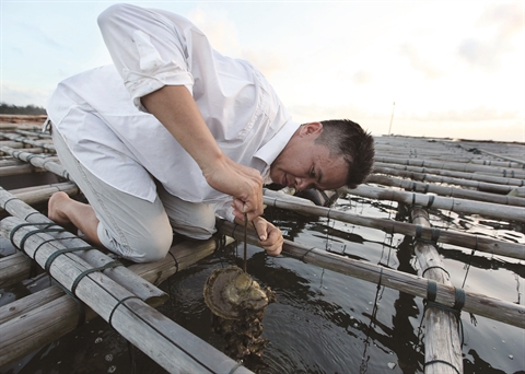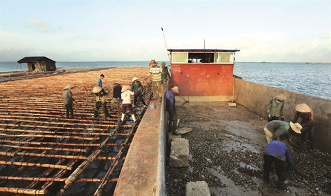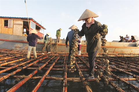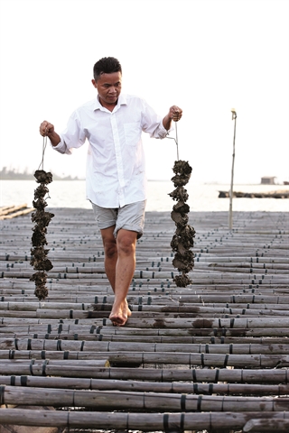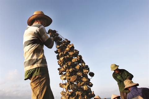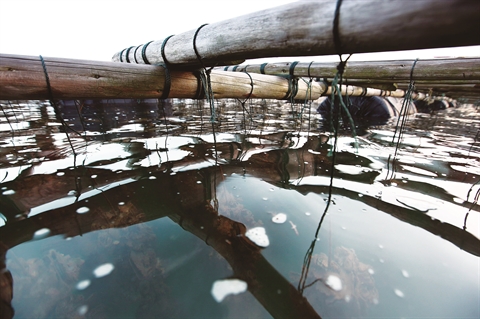 | Des pêcheurs vietnamiens et chinois acheminent des jeunes huîtres d’élevage vers un radeau à Trà Cô. |