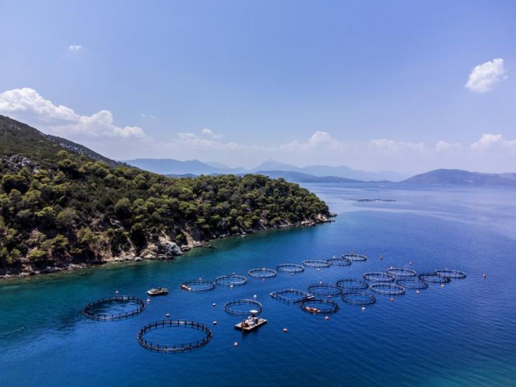 | Fermes piscicoles dans la mer Égée, au large de l'île de Poros, en Grèce, le 5 juillet 2023. |