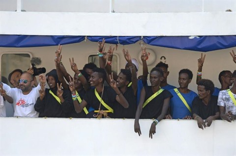 | Des migrants à bord de l'Aquarius lors de son arrivée à Malte le 15 août |