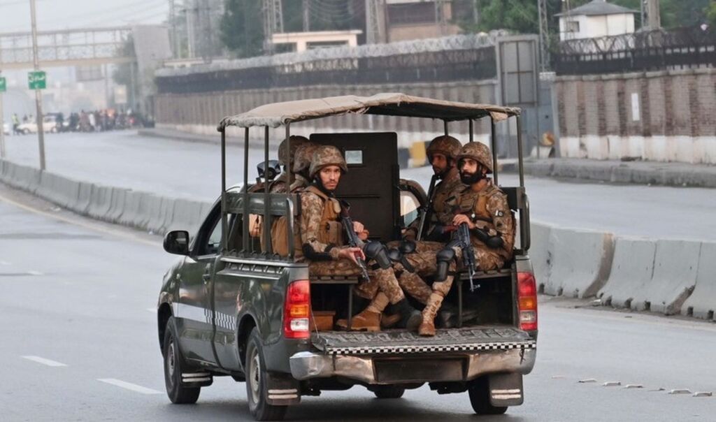 | Des agents de sécurité patrouillent la route menant à la base aérienne de Nur Khan à Rawalpindi, au Pakistan, le 10 mai. |