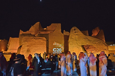 | Le logo du G20 est projeté sur un site historique en banlieue de la capitale saoudienne Ryad, le 20 novembre. |