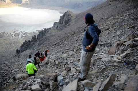| Des randonneurs et leur guide s'approchent du cratère volcanique d'Al Wahbah, à quelque 360 km au nord-est de Jeddah, en Arabie saoudite, le 17 novembre 2017. |
