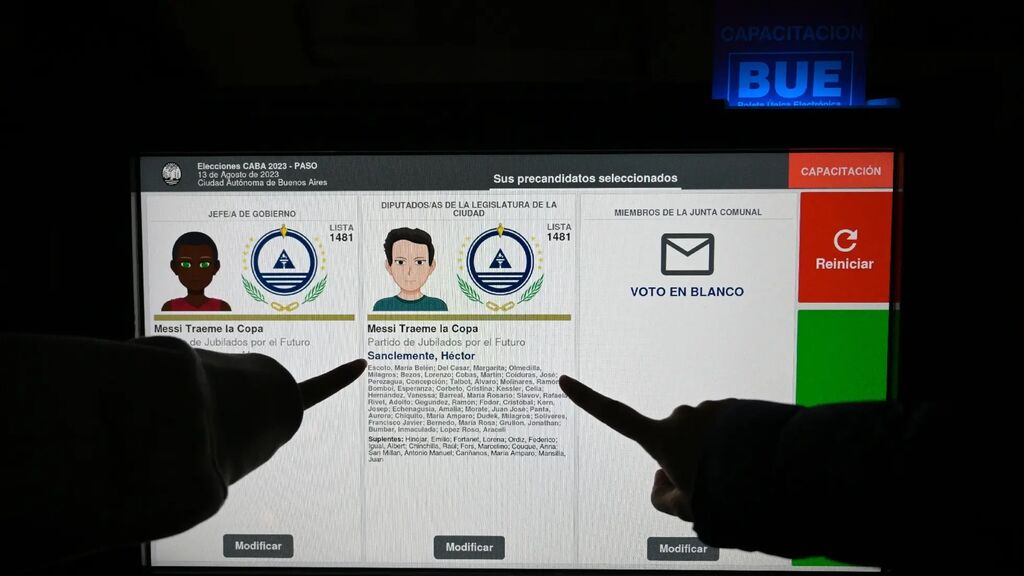 | Un écran informe les électeurs du processus de vote aux primaires, le 13 août à Buenos Aires. |