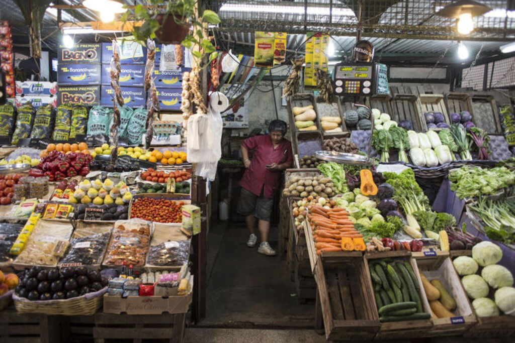 | Un vendeur dans son magasin de fruits et légumes à Buenos Aires, en Argentine. |