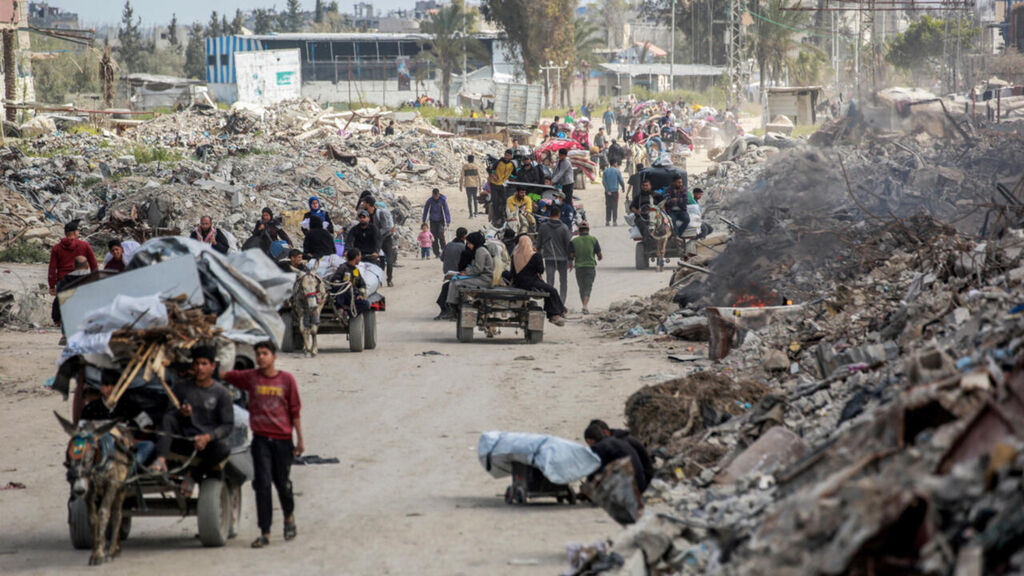 | Des Palestiniens quittent Beit Hanoun, dans le Nord de la bande de Gaza, avec leurs biens, en direction de la ville de Gaza après des ordres d'évacuation israéliens, le 19 mars. |
