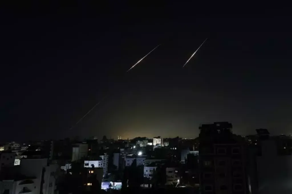 | Des projectiles iraniens dans le ciel, vus depuis la bande de Gaza le 5 mars. |