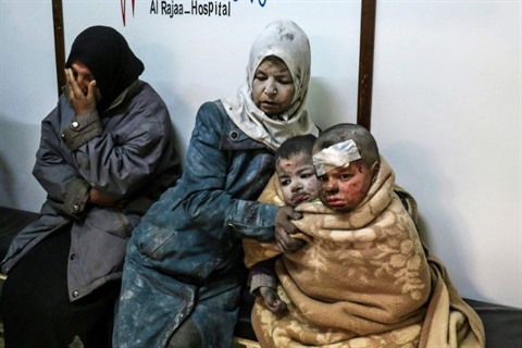 | Une femme syrienne et des enfants blessés patientent dans un hôpital après des frappes sur le quartier de Barzé, en périphérie de Damas, le 20 février. |