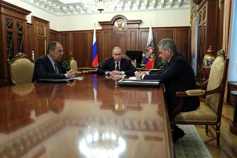 | De gauche à droite : le ministre russe des Affaires étrangères Sergei Lavrov, le président russe Vladimir Poutine et le ministre russe de la Défense Sergei Shoigu, le 29 décembre au Kremlin. |