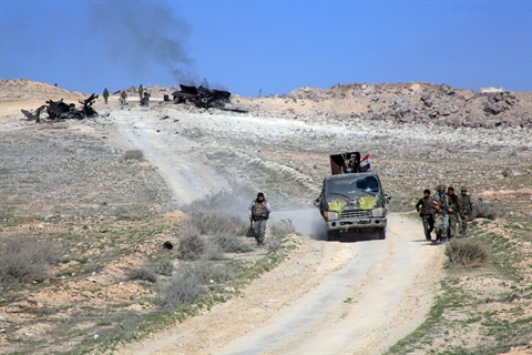 | La force pro-gouvernementale de la Syrie sur une route à travers la ville d'El Khanasser, près d'Alep, le 29 février. |
