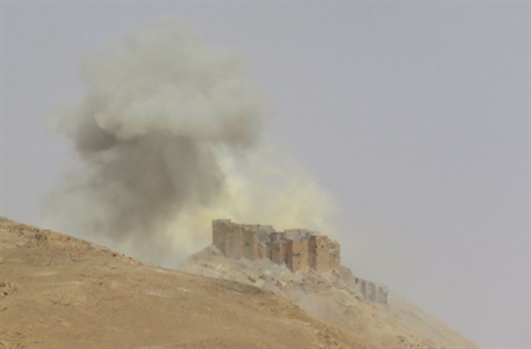 | De la fumée s'élève au-dessus de la cité antique de Palmyre, en Syrie, le 25 mars 2016. |