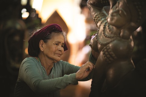 | La potière octogénaire Truong Thi Gach en train de réaliser une œuvre représentant une danseuse aspara. |