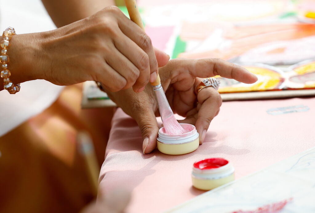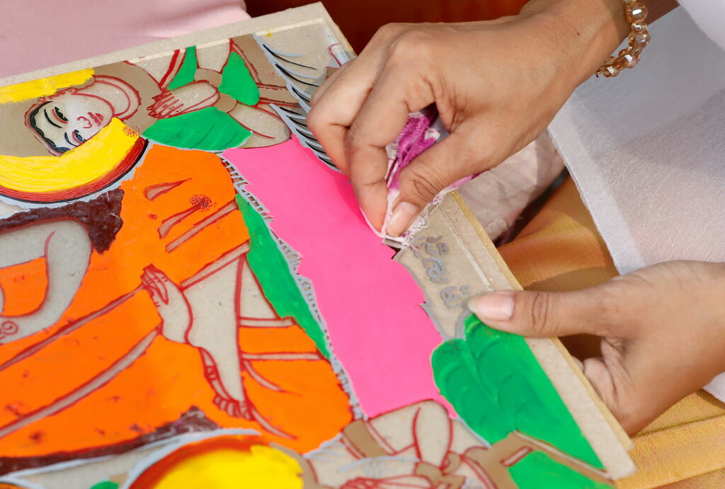 Une fois que les couleurs sont sèches, il utilise de la nacre et des paillettes dorées pour décorer le dessous de la peinture. Enfin, le peintre applique une couche de protection sur le tableau avant de l’encadrer. Parmi les différents thèmes, les peintures représentant Bouddha sont considérées comme les plus difficiles. Capturer l’expression sereine du Bouddha, des yeux émouvants à son doux sourire, nécessite la maîtrise d’artisans expérimentés.