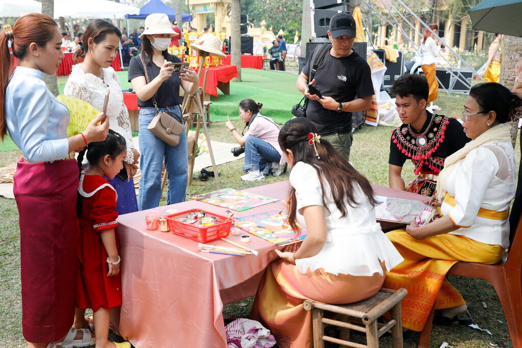 | Des visiteurs apprennent l’art de la peinture sur verre inversé des Khmers au Village culturel et touristique des ethnies du Vietnam. |