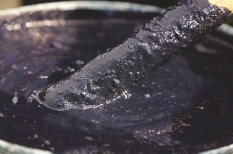 La teinture à l’indigo est un long processus. On doit notamment, pendant tout un mois, et ce deux fois par jour, faire tremper le tissu dans un jarre d’indigo puis le faire sécher.