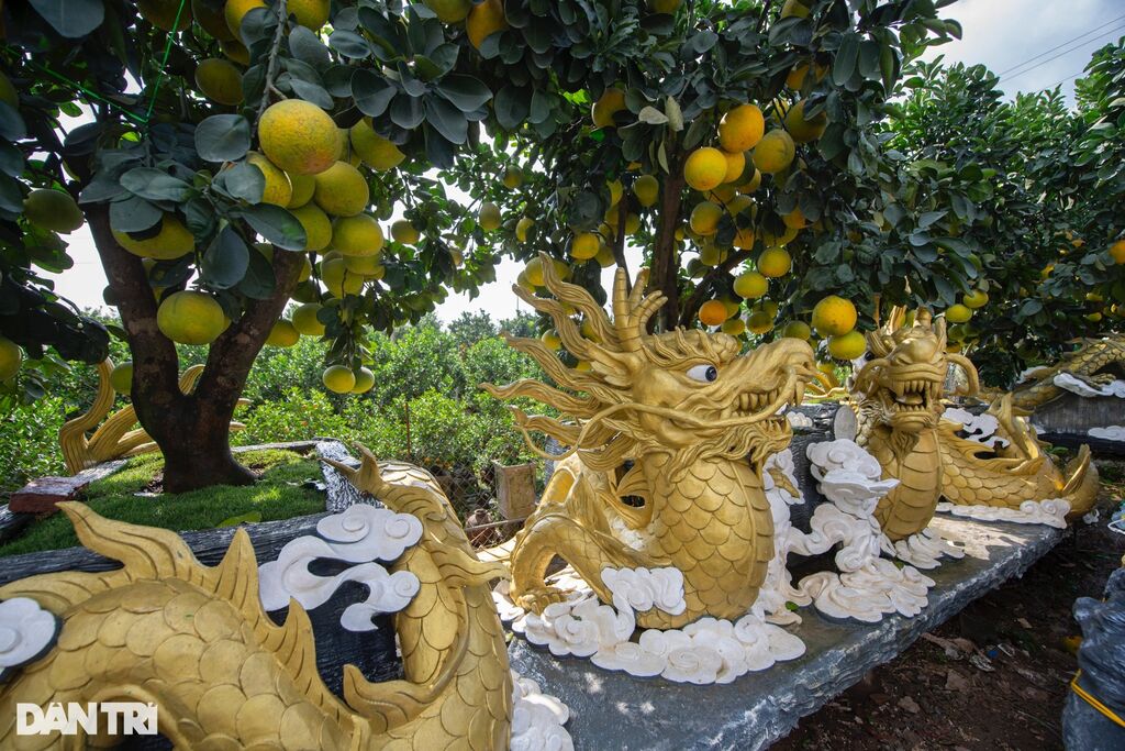 Les kumquats sont soigneusement sélectionnés et reçoivent un soin particulier dès le début de l'Année du Chat (2023). Il y a quelques mois, les plantes ont été placées dans des pots. M. Xuân a créé deux paires de dragons en kumquat : une paire de dragons debout et une paire de dragons chevauchant les nuages, jouant avec l'eau.
