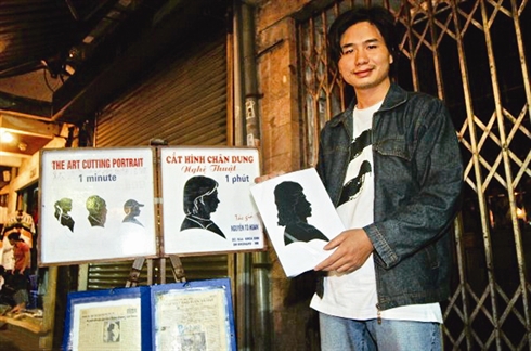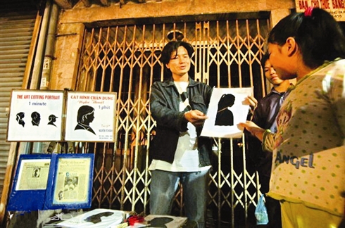 Dans un coin du marché nocturne qui se tient chaque week-end dans la rue de Hàng Dào (rue de la Soie) dans le vieux quartier de Hanoi, le peintre Tô Hoàng est assis sur un tabouret, à côté de quelques-uns de ses portraits découpés, accrochés bien en vue et agrémentés de ces mots : «Découpage d’art : un portrait en une minute, 10.000 dôngs».
