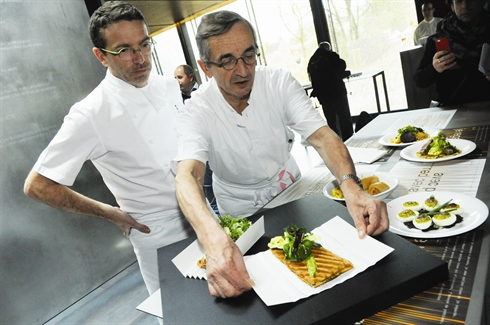 | Le chef étoilé Michel Bras (1er plan) et son fils Sébastien présentent l’un des plats du restaurant qu’ils ouvrent au musée Soulages de Rodez. |
