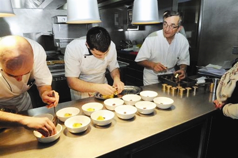 | Le chef étoilé Michel Bras (droite) prépare un plat dans la cuisine de son restaurant du musée Soulages de Rodez. |
