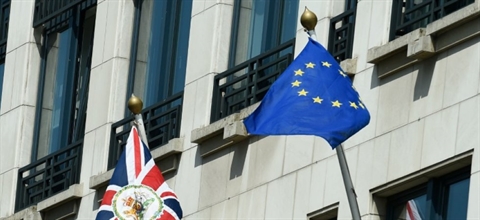 | Le drapeau du Royaume-Uni et celui de l'Europe, le 24 juin 2016 devant la représentation britannique à Bruxelles. |