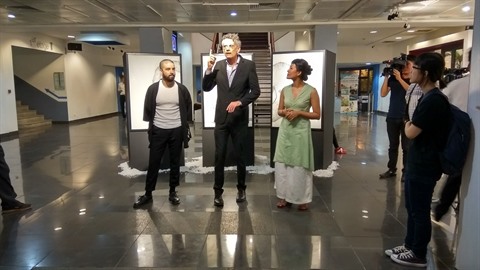 | Le directeur de L’Espace, Emmanuel Labrande (centre), au vernissage de l’exposition «Les gestes de nos mémoires» de Florian Nguyên (gauche), le 21 avril à Hanoï. |
