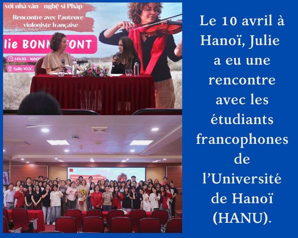 Le 10 avril à Hanoï, Julie a été invitée par le Département de français de l’Université de Hanoi (HANU) pour une rencontre spéciale avec les étudiants francophones. "Les étudiants m’ont posé des questions sur mon roman Vibrato, paru en 2023 aux Éditions L’Harmattan. Je leur ai également présenté l’anthologie +Poétesses francophones contemporaines+, parue ce printemps et dans laquelle figure un de mes poèmes inédits. Cette partie nous a permis d’évoquer longuement la poésie et ce que celle-ci permet d’exprimer. Enfin, nous avons parlé de mon roman à paraître et de son ancrage vietnamien".