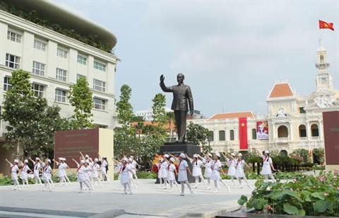| La statue du Président Hô Chi Minh de Lâm Quang Noi mesure 7,2 mètres de haut, est placée devant le siège du Comité populaire municipal, sur la place piétonne Nguyên Huê. |