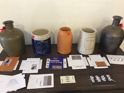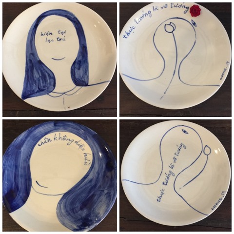 Sur une quarantaine de céramiques produites dans les trois villages de Bat Tràng (Gia Lâm, Hanoï), Huong Canh (Vinh Phuc) et Phù Lang (Bac Ninh), Lê Thiêt Cuong a dessiné et inscrit des textes bouddhistes.
