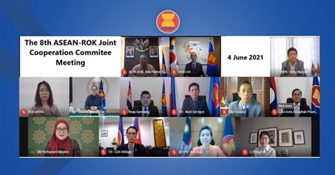 | La 8e réunion du Comité mixte de coopération ASEAN - République de Corée organisée le 4 juin par vidéoconférence. |