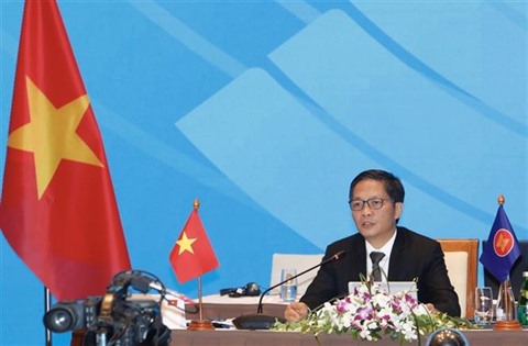 | Trân Tuân Anh lors d'une consultation virtuelle des ministres de l’Économie de l’Association des nations de l’Asie du Sud-Est et de la République de Corée. |