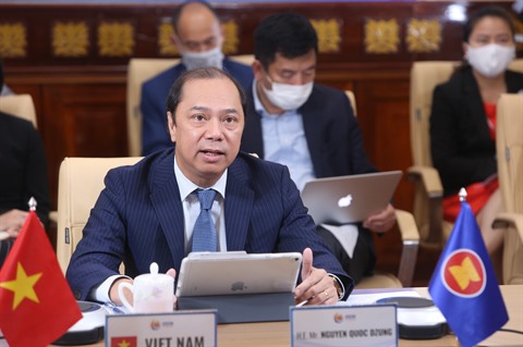 | Le vice-ministre vietnamien des Affaires étrangères Nguyên Quôc Dung lors de la vidéoconférence, le 1er avril. |