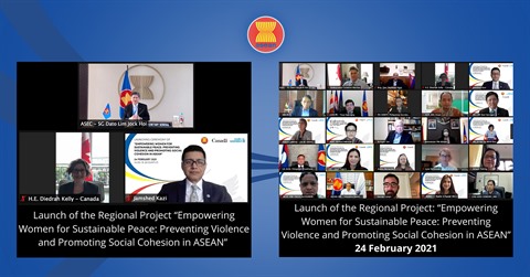 | Capture d'écran de la réunion virtuelle ASEAN - Canada sur le rôle des femmes dans la prévention des conflits, le 26 février. |
