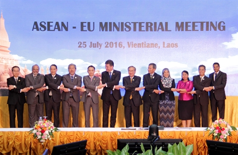 | Photo de famille des délégués lors de la réunion ministérielle ASEAN-UE, le 25 juillet à Vientiane, au Laos. |
